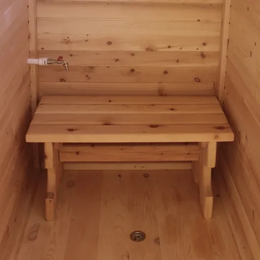 Баня-буханка более просторная за счет увеличенной высоты потолков и ровного пола. Козырек не только украшает баню, но и защищает оставленную обувь от дождя. Лавочки из кедра находятся по всей длине бани-бочки с обеих сторон. Печь расположена в парилке около дальней стены. Время растопки такой бани не превышает 30 минут. В зависимости от выбранного размера баня-бочка буханка с козырьком имеет следующую комплектацию: