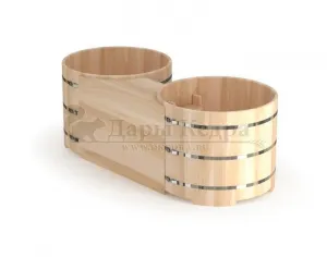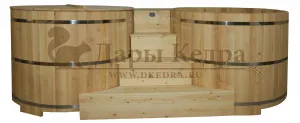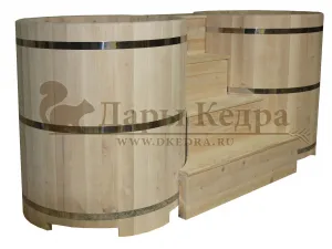 Двойная купель из кедра чаще всего используется в крупных банных комплексах и оздоровительных центрах. Она представляет собой две круглые чаши для воды, в которых люди отдыхают после парения. Между купелями установлен широкий подиум из кедра, по которому могут спускаться и подниматься сразу несколько людей. Для комфортного отдыха купель оснащена лавочками и двумя дополнительными лестницами. За счет стяжных болтов обручи из нержавеющей стали плотно прилегают к кедровой купели. Это позволяет равномерно распределять нагрузку воды и сохранить форму изделия в период эксплуатации. При правильном уходе купель для бани не рассыхается и не подвергается гниению.