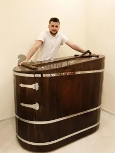 Готовый комплект - это полностью укомплектованный набор с полулежачей фитобочкой для процедур парения. Такая модель наиболее комфортна, так как позволяет принимать процедуры полулежа. Толщина стенок составляет 40-45 мм, что позволяет увеличить срок службы изделия. Фитобочка оборудована откидными створками, дверцей и отверстием для головы. Во время парения человек находится внутри кедровой бочки, а голова снаружи. Благодаря этому исключается возможность перегрева