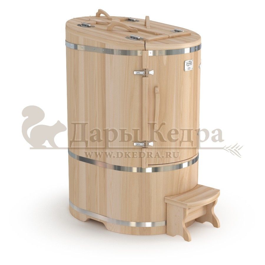 Кедровая бочка (фитобочка) овальная «Классическая» Овальная фитобочка из кедра - это мини парная, которую можно использовать не только в спа-салонах, но и дома. Овальная модель более просторна и удобна в использовании. Толщина стенок составляет 25 мм. Она оборудована откидными створками, дверцей и отверстием для головы. Во время парения человек сидит внутри кедровой бочки, а голова находится снаружи. Благодаря этому исключается возможность перегрева. Подлокотники из кедра, встроенные ручки на створках и двери делают эксплуатацию более удобной. Парение в фитобочке благотворно влияет на организм в целом: повышается иммунитет, выводятся шлаки и токсины, улучшается работа органов тела и состояние кожи.