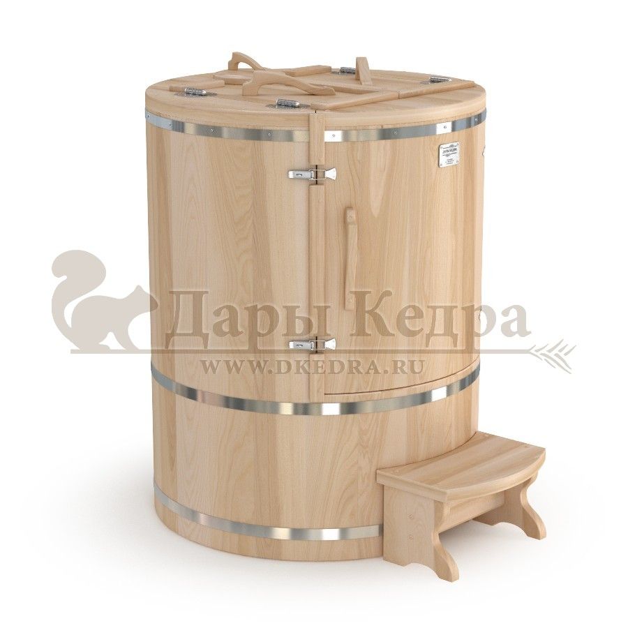 Готовый комплект «Удобный+»: кедровая бочка с парогенератором + био-защита изнутри и снаружи Готовый комплект - это полностью укомплектованный набор с фитобочкой для процедур парения. Овальная модель более просторна и удобна в использовании. Толщина стенок составляет 25 мм. Бочка оборудована откидными створками, дверцей и отверстием для головы. Верхний скос изделия делает положение головы более комфортным и улучшает обзор. Во время парения человек сидит внутри кедровой бочки, а голова находится снаружи. Благодаря этому исключается возможность перегрева. Подлокотники из кедра, встроенные ручки на створках и двери делают эксплуатацию более удобной. Парение в фитобочке благотворно влияет на организм в целом: повышается иммунитет, выводятся шлаки и токсины, улучшается работа органов тела и состояние кожи.