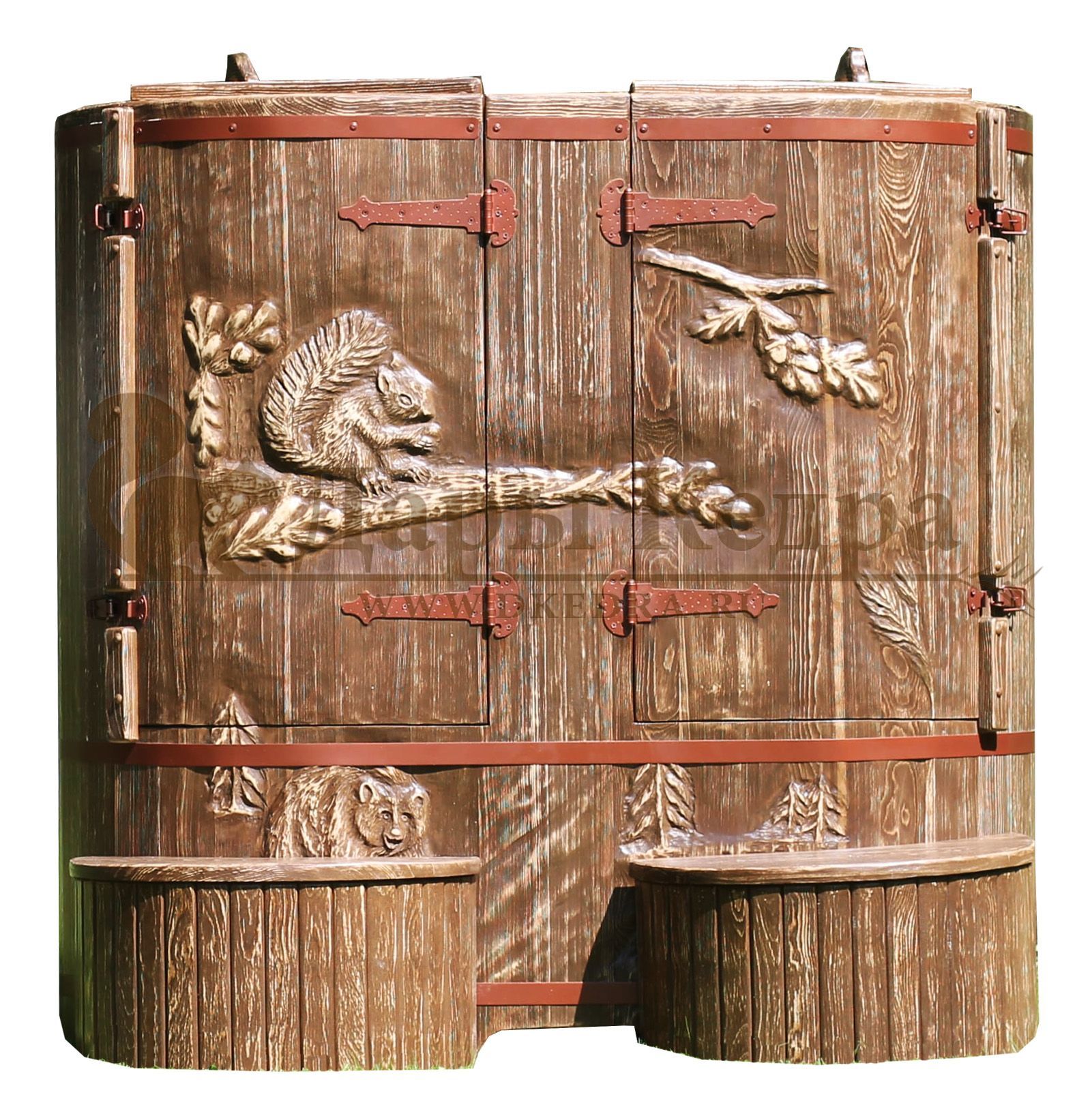 Кедровая бочка (фитобочка) «Огненная лошадь» Любая модель эксклюзивной фитобочки - это выбор не только дизайнеров и ценителей красоты, но и тех, кто любит нестандартный подход в любых деталях. С оригинальной авторской фитобочкой 'Дары Кедра' ваша квартира, дом или салон красоты станут объектом всеобщего внимания, ведь такая фитобочка - это не просто смело, красиво и достойно, это еще и очень полезно для Вашего здоровья! В стоимость любой модели фитобочки «Белка в лесу» входят: Покрытие воском/лаком снаружи и маслом - внутри; Изменение цвета; Резьба на дверце. Эксклюзивная фитобочка может быть представлена в разной цветовой гамме: После того, как цвет фитобочки выбран, необходимо определиться с вариантом резьбы (или предложить свой): Также можно дополнить данную фитобочку искусственным старением и вместо обручей из нержавеющей стали выбрать декорирование канатной веревкой (Данные опции оплачиваются отдельно)
