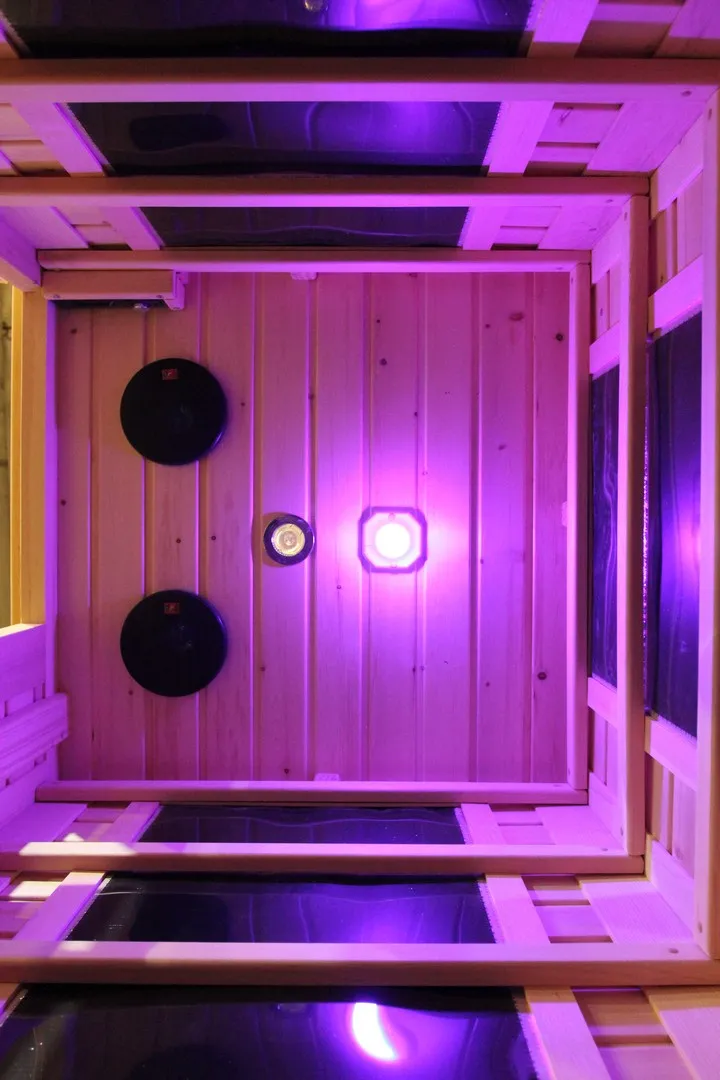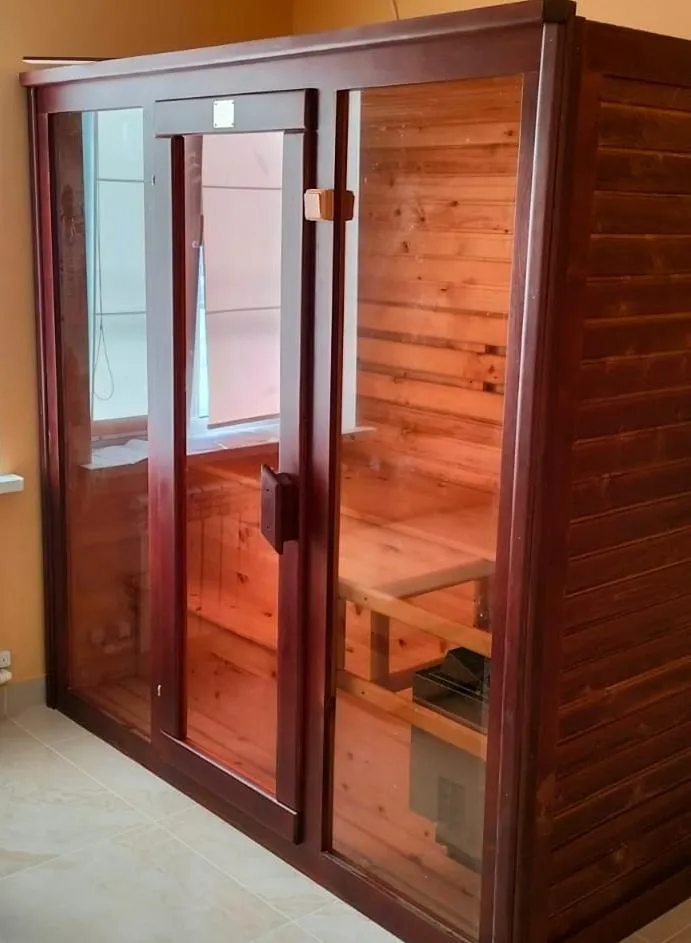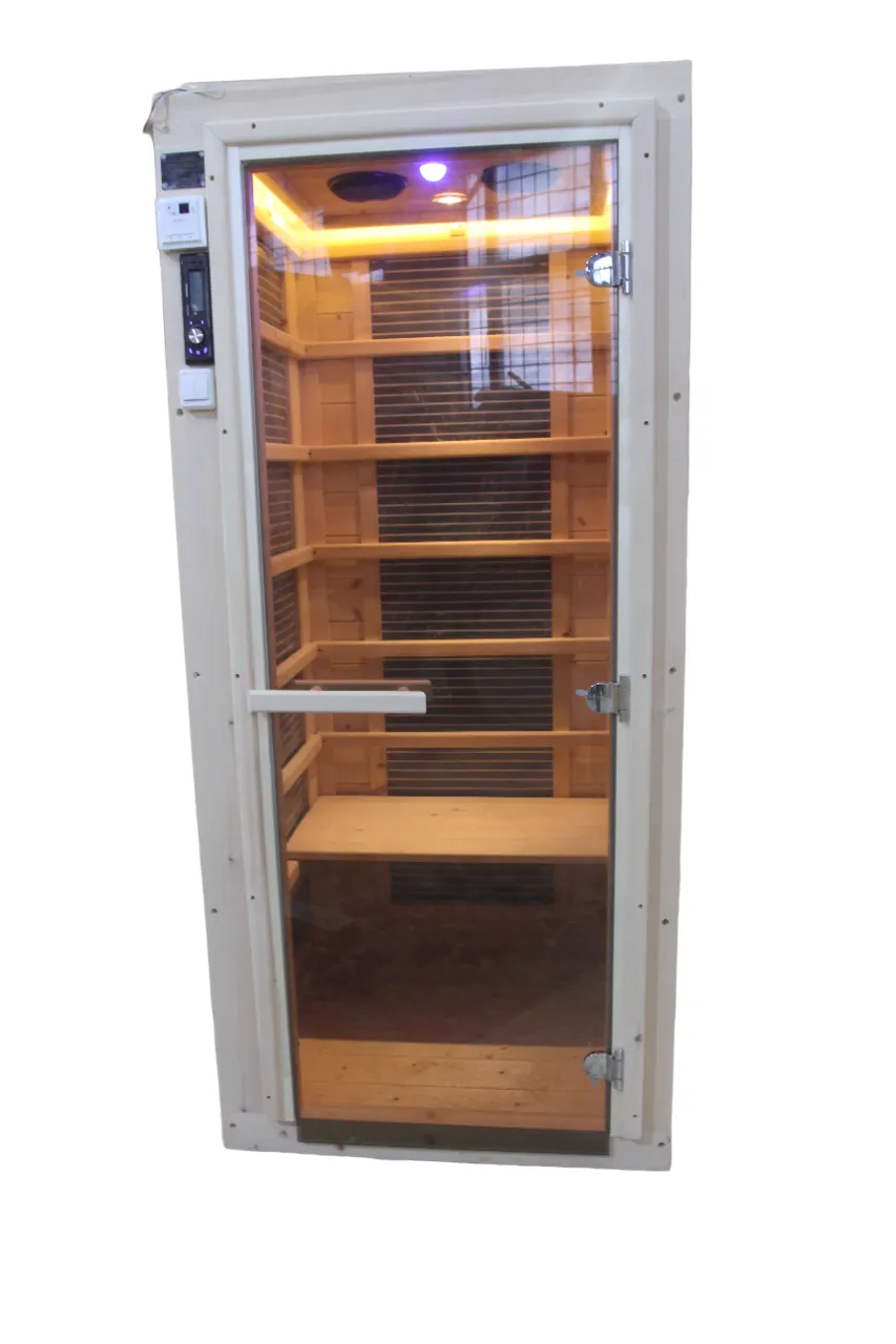 Это специально оборудованная кедровая кабина для прогрева тела человека сухим теплом. Воздух в таких парных не нагревается. Инфракрасные лучи воздействуют на тело, равномерно прогревая мышцы, суставы и органы. Карбоновые излучатели, встроенные в стены кабины, обладают мягким прогревом, что полностью исключает возможность ожога. Работает кабина за счет электричества. Пятиместная инфракрасная сауна с карбоновыми излучателями подходит для коммерции.