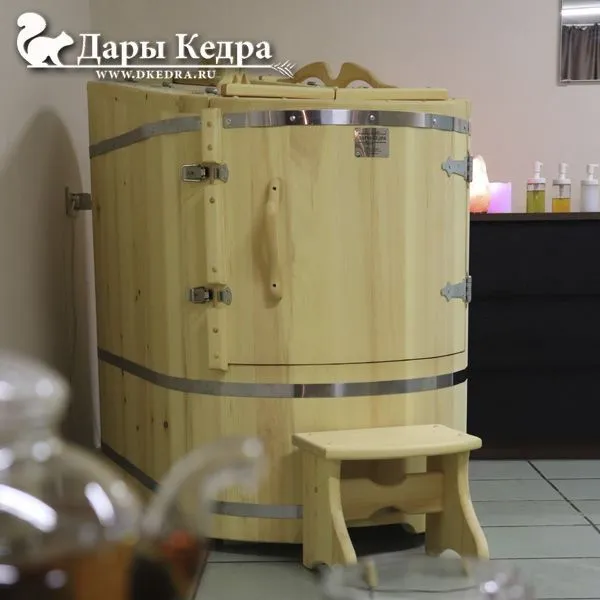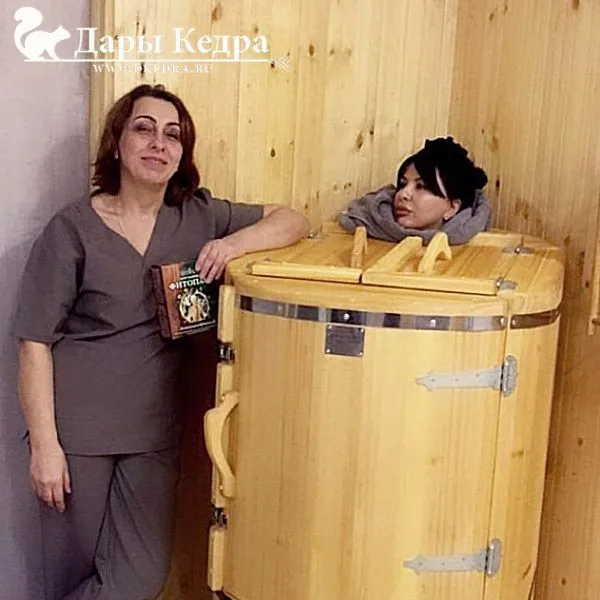 Кедровая фитобочка - это мини-парная, которая занимает не больше 1 кв.м., поэтому может быть установлена практически в любом помещении. За счет своих небольших габаритов она получила распространение и популярность среди салонов красоты, массажных кабинетов, оздоровительных центров. Конструкция кедровой парной предполагает наличие установленного сиденья и подлокотников для комфортного фитосеанса, который длится в среднем 15 минут. Голова пациента находится снаружи, вокруг шеи пустое место закладывается полотенцем, препятствующим выходу пара изнутри. Данная процедура практически не имеет противопоказаний и ее легко переносят даже дети и пожилые люди.